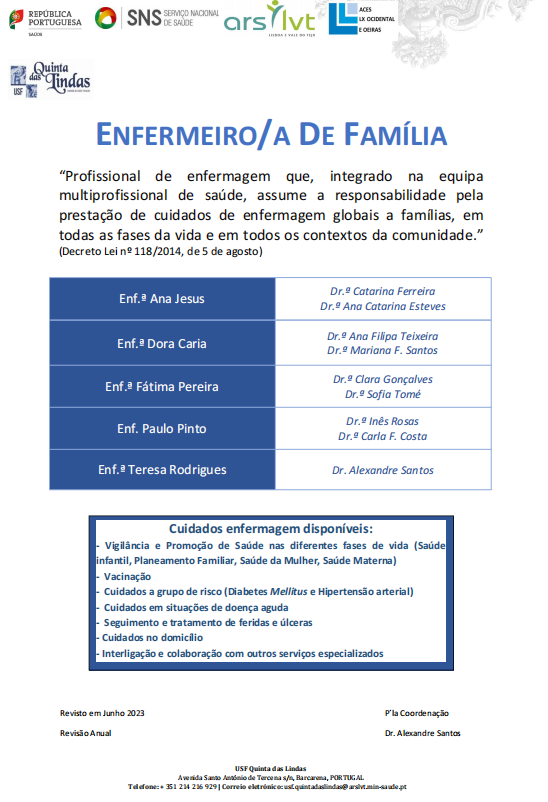 De acordo com o Decreto Lei nº118/2014, o enfermeiro de família é o profissional de enfermagem que, integrado na equipa multiprofissional de saúde, assume a responsabilidade pela prestação de cuidados de enfermagem globais a famílias, em todas as fases da vida e em todos os contextos da comunidade.